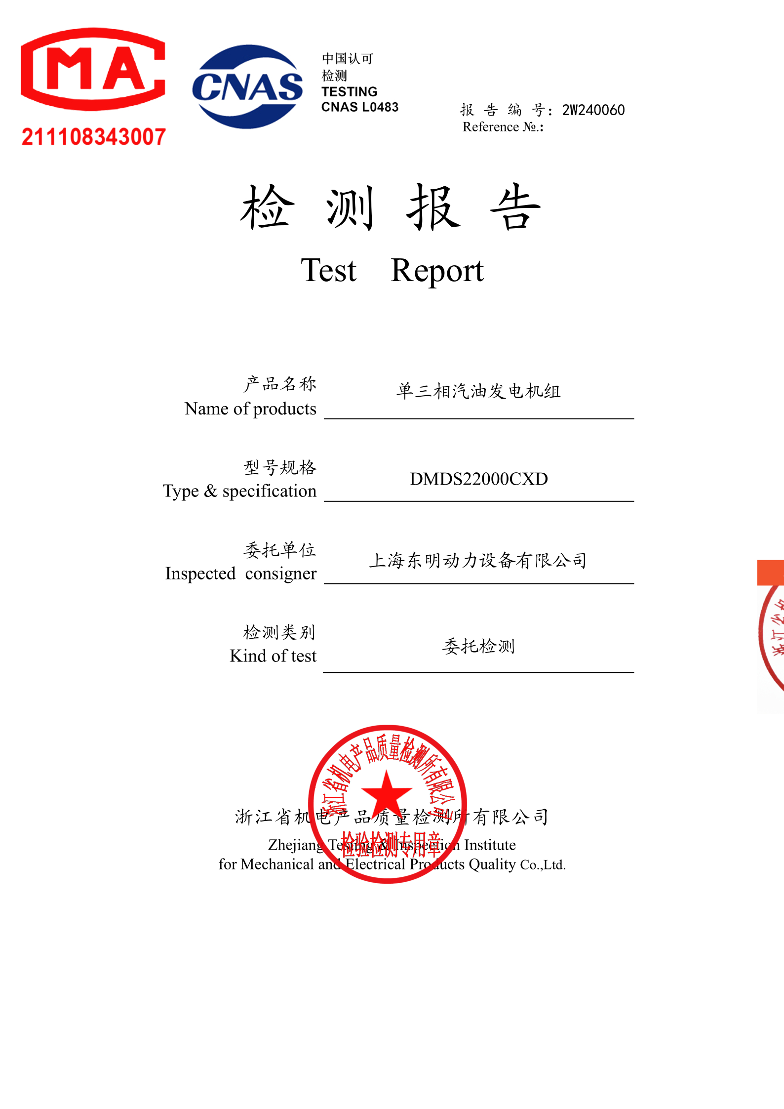 作為工業級發電設備,DMDS22000CXD 已完成專業機構檢測,具備完整檢測報告,核心指標均符合相關標準要求,可提供合規文件用于項目報備、驗收及資質審核。