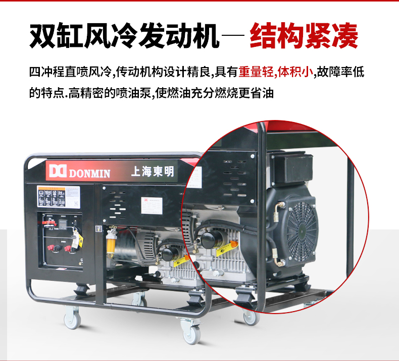 - 上海東明15KW 15000W柴油發電機組DMD18000LE ◆采用雙缸V型柴油動力,精密噴油泵,燃燒充分、省油、動力強勁; ◆大型消音器,動平衡轉軸,低噪音機組特殊設計,采用具有減震功能的外殼與框架; ◆大容量油箱確保長時間的連續工作; ◆無熔絲斷路器提供過載保護,電容電壓調節器,確保穩定電壓輸出; ◆耐用的四輪拖動式底座結構,移動方便。